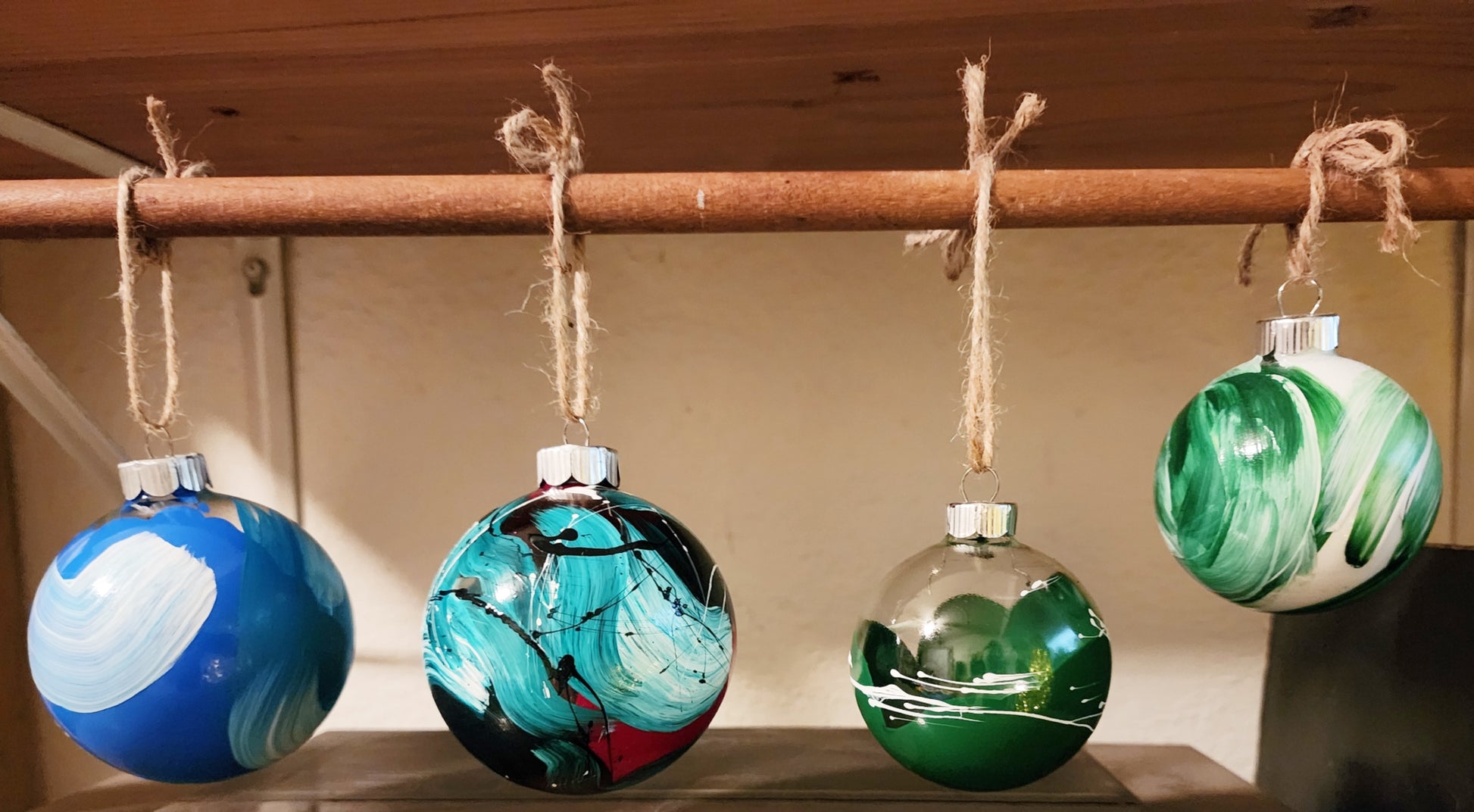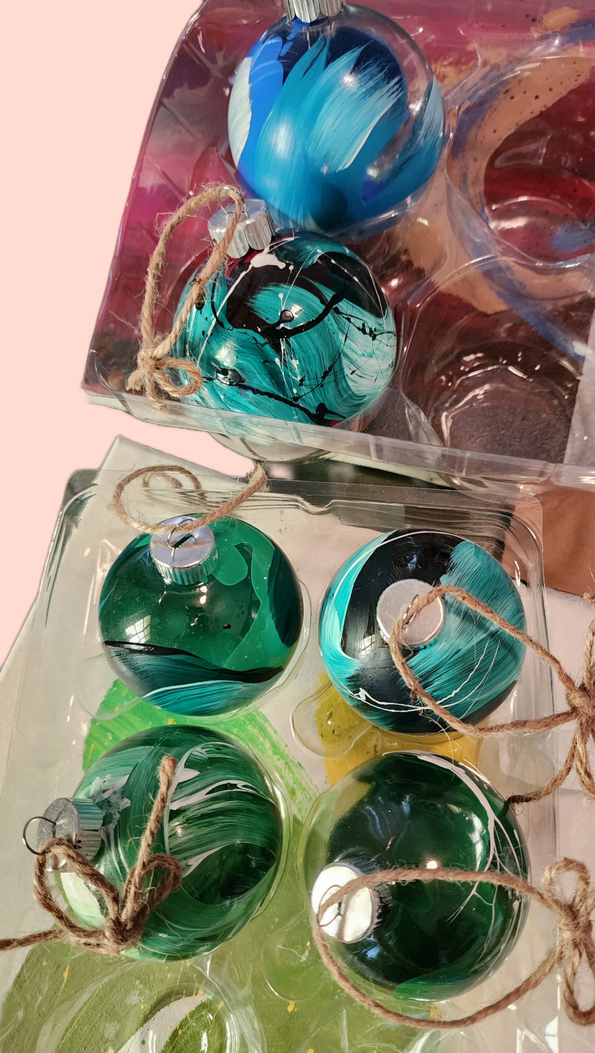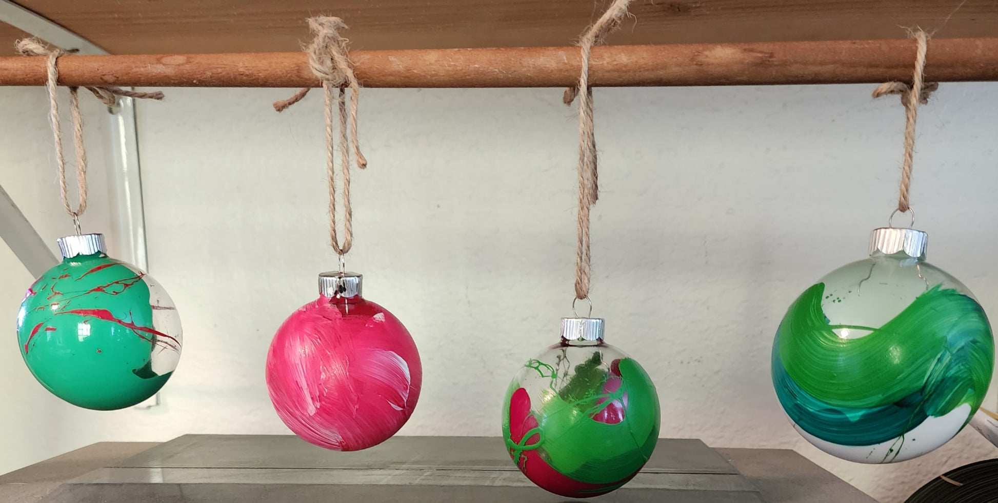 Small and large size hand painted glass ornaments. Acrylic and gloss sealed.