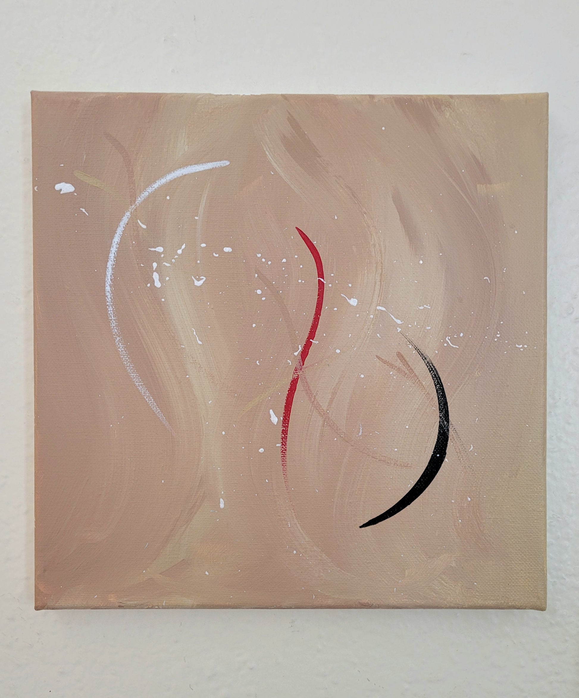 Modern contemporary acrylic abstract painting on 10x10 stretched canvas. Red, black, pearl and nude colors.